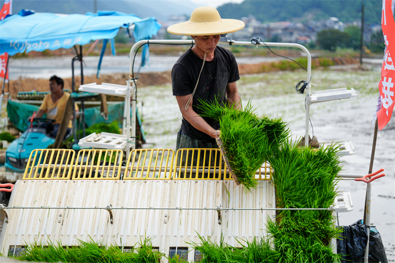 农民把秧苗放到插秧机上,准备插秧。新华网发(盘斌 摄)